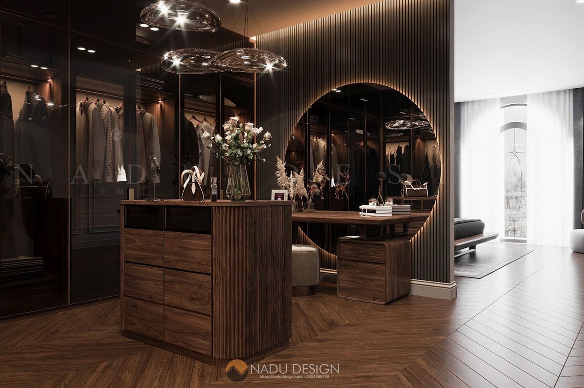 Chất liệu nội thất: Thường sử dụng các chất liệu cao cấp hiện đại như gỗ óc chó, gỗ công nghiệp An Cường, đá nhân tạo, cùng các bề mặt kim loại, da cao cấp.